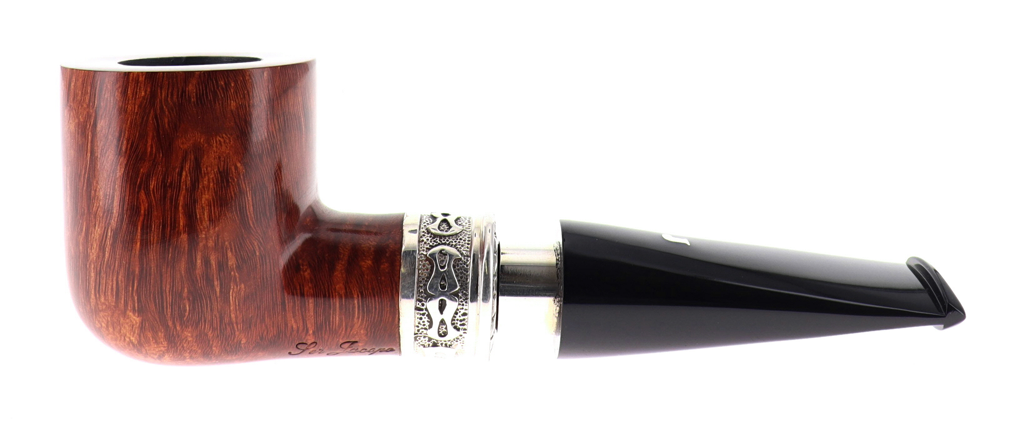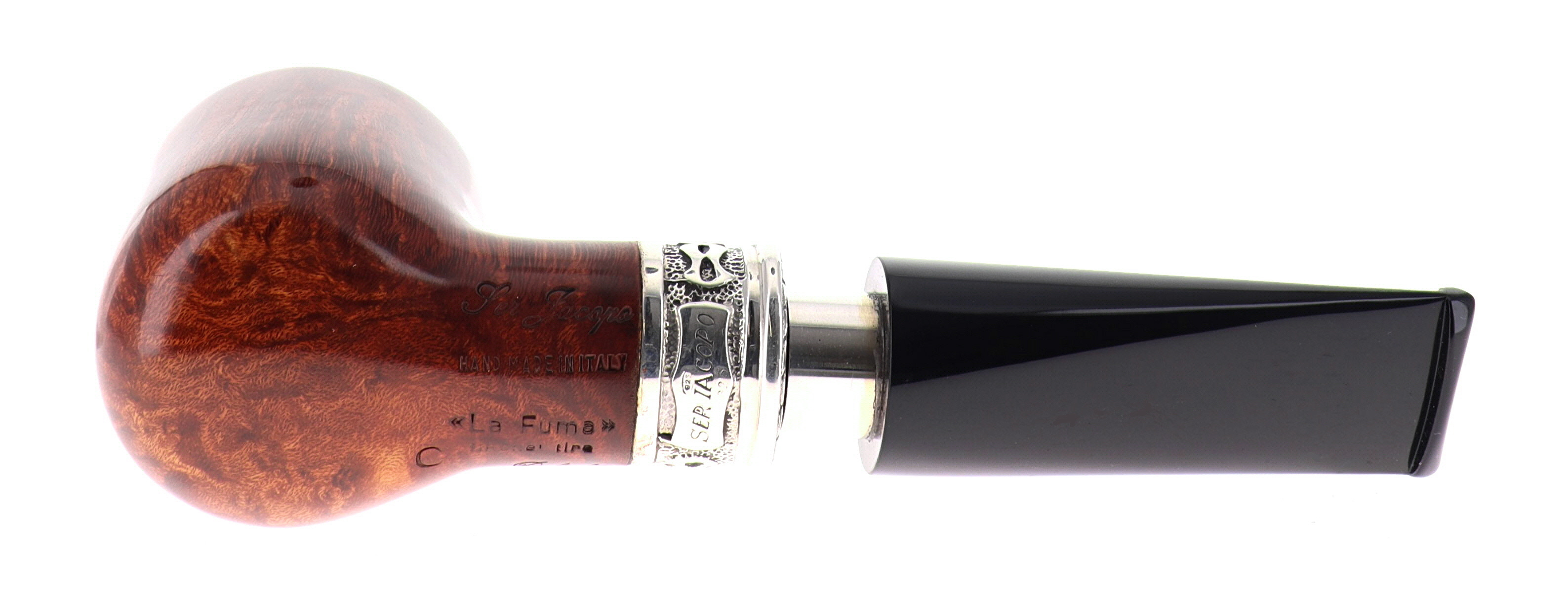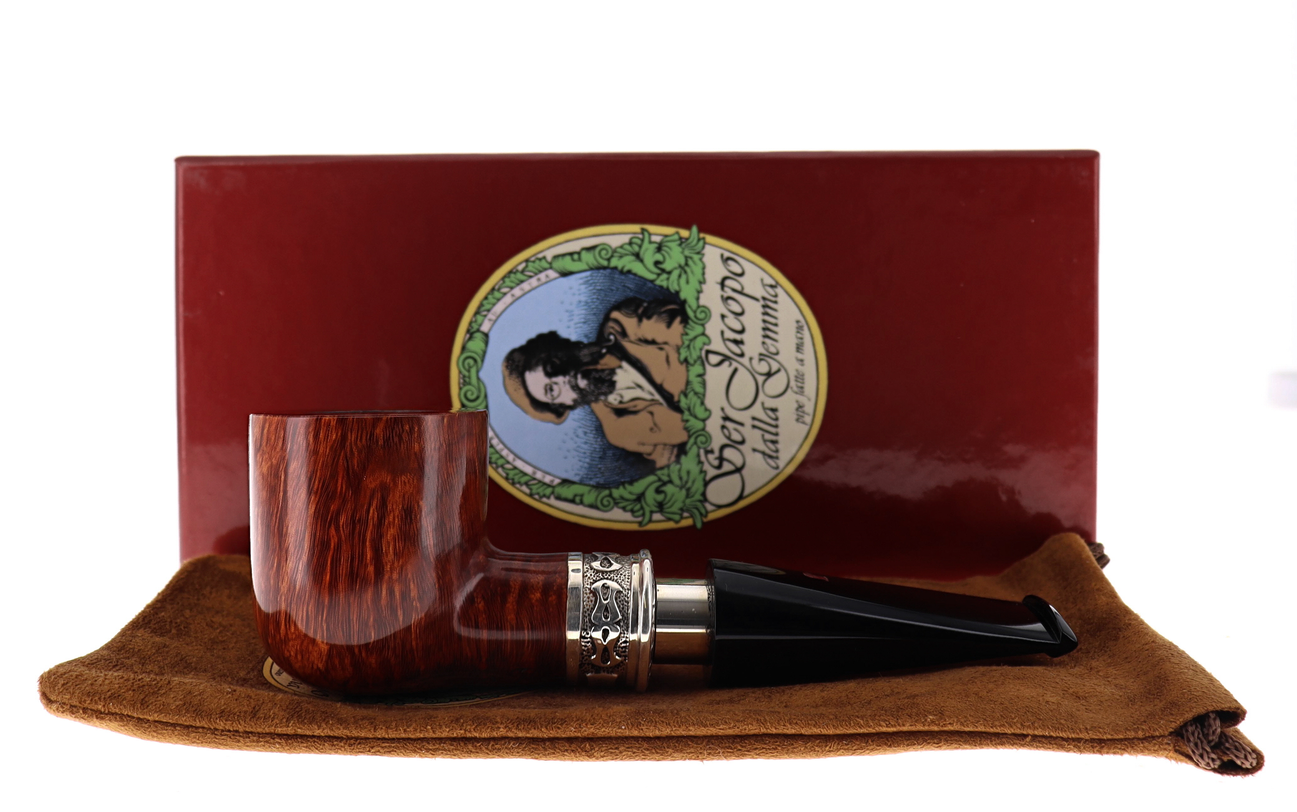 Pipa Ser Jacopo della Gemma 557 LA FUMA FINCHE TIRA C DELECTA, finissaggio liscio marrone, shape billiard con vera in argento, bocchino in metacrilato con vera in argento. Con scatola e sacchetto originale in panno. Perfetta, nuova, mai fumata. Made in Pesaro, Italy.