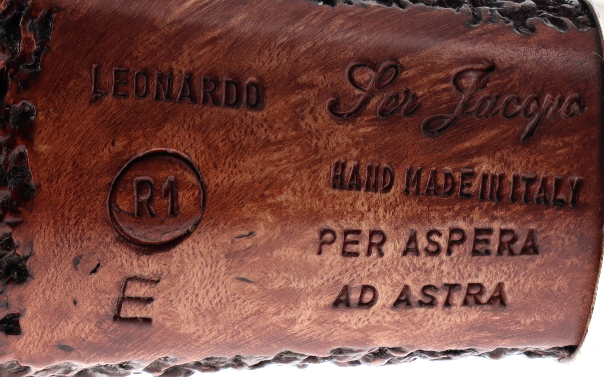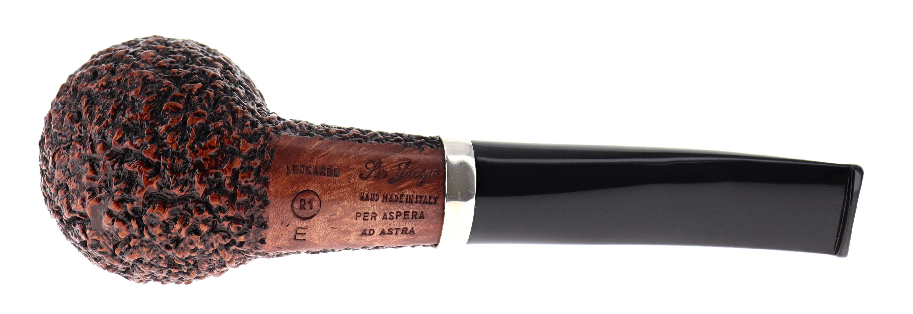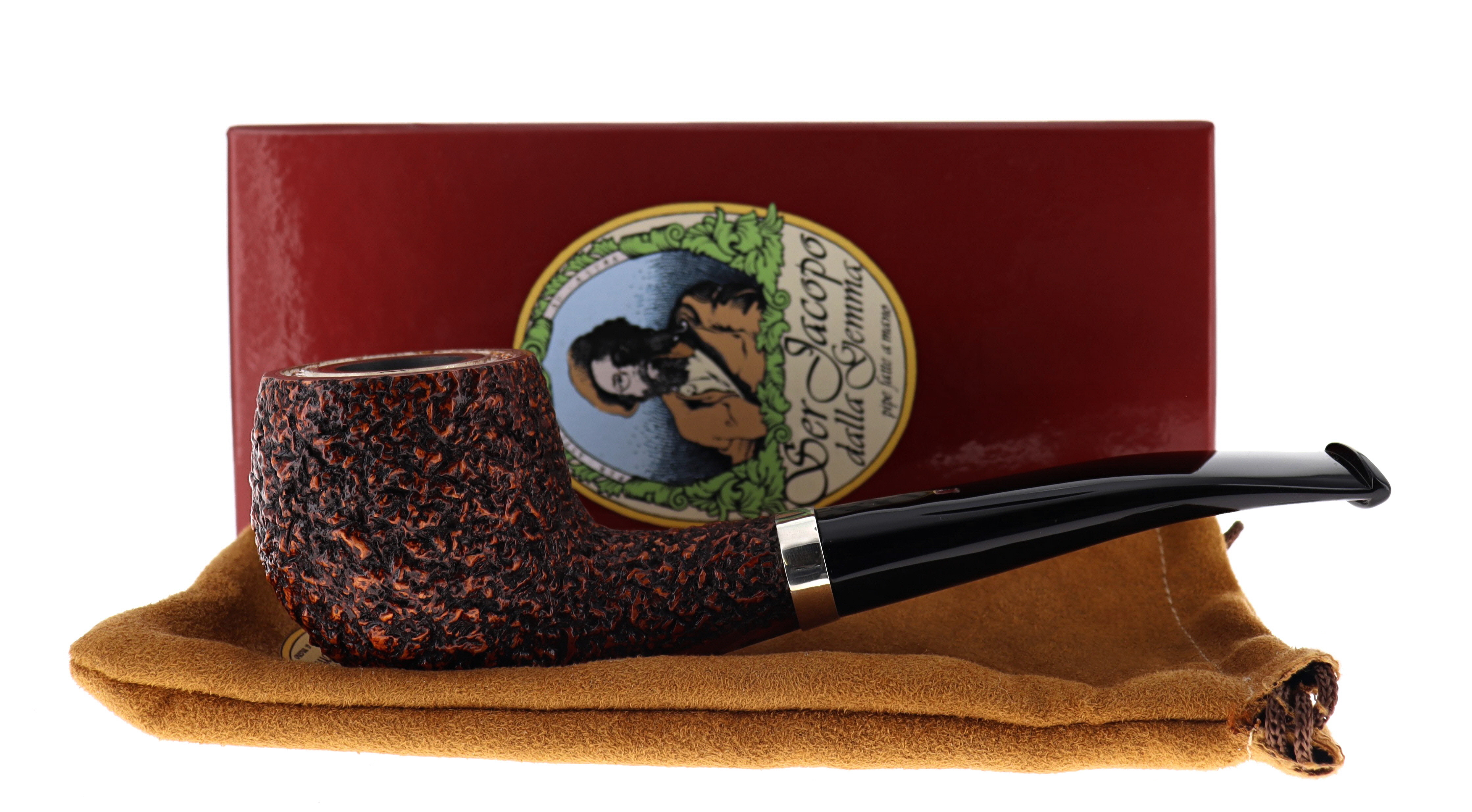 Pipa Ser Jacopo della Gemma 555 R1 E LEONARDO, finissaggio rusticato marrone, shape apple semicurva con vera in argento, bocchino in metacrilato. Con scatola e sacchetto originale in panno. Perfetta, nuova, mai fumata. Made in Pesaro, Italy.