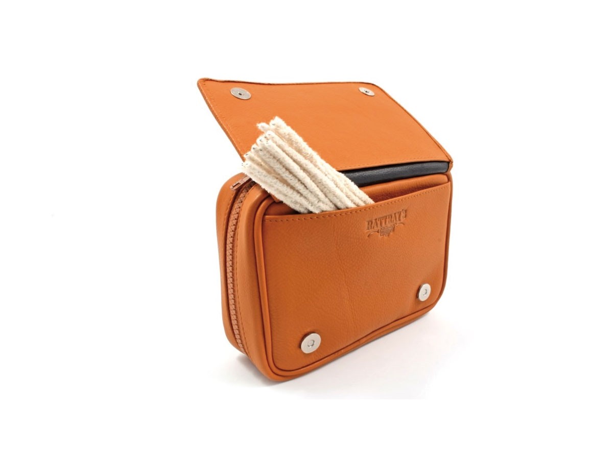 La zip principale apre lo scomparto unico nel quale trovano posto tre pipe (bloccate da passanti in pelle) e il curapipe inserito in una apposita tasca centrale con impresso il logo Rattray's.