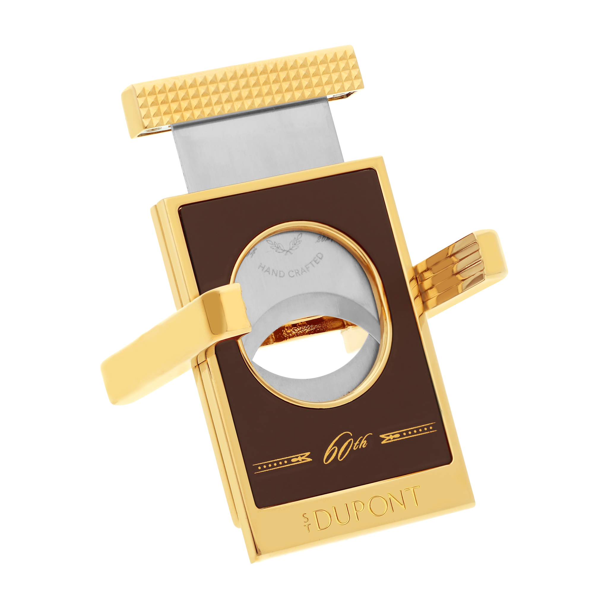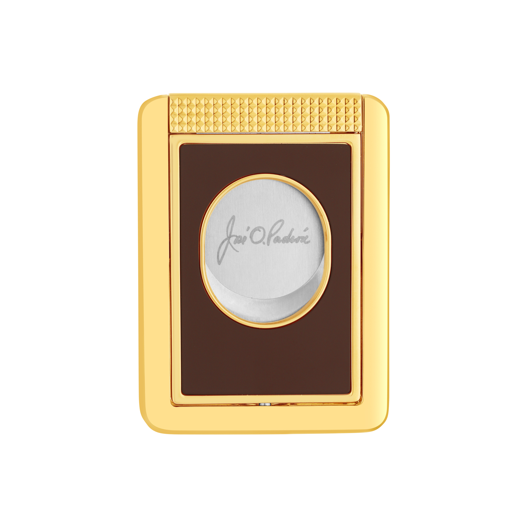 Taglia sigaro in metallo con inserti in lacca marrone opaca e finiture dorate.