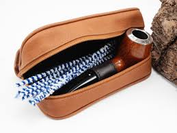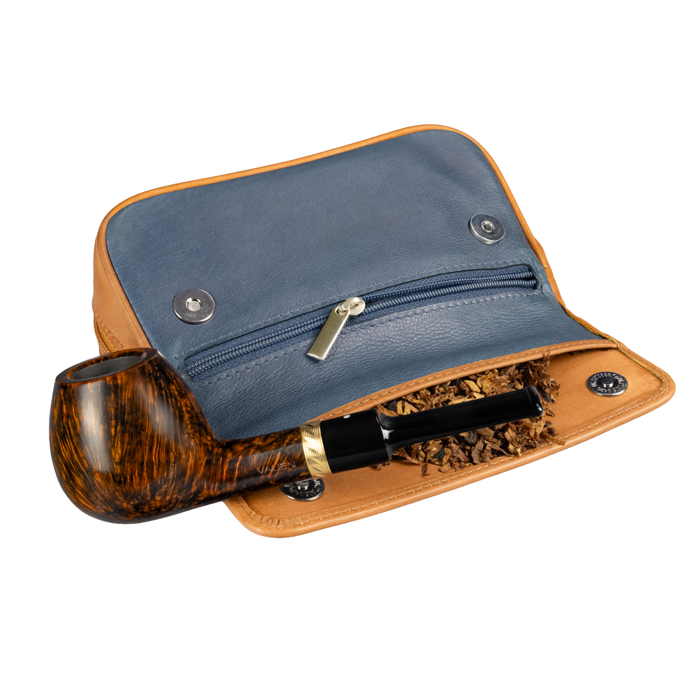 Una borsa compatta per una pipa e i relativi accessori. È dotata di uno scomparto separato per il tabacco sfuso, completamente foderato in lattice per una ottimale tenuta della fragranza e dell'umidità del tabacco stesso, di una tasca principale per pipa e un accessorio e di una secondaria - entrambe con ciusura a cerniera - per filtri, pulisci tabacco, accendino o altri utensili. Il materiale principale è pelle marrone chiaro con logo in rilievo, chiusa saldamente con due bottoni automatici magnetici.