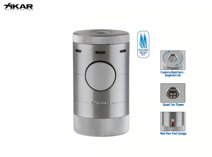 Pontente quadrupla fiamma JetFlame per questo bellissimo accendino da tavolo. Eccellente per l'accensione del sigaro. Stabile, moderno e robusto è comodo da utilizzare grazie all'ampio tasto sul fianco. Molto potente ed affidabile. Regolazione facile grazie all'ampia rotella inferiore dotata di micro scatti, bruciatore protetto da una doppia lamella a chiusura/apertura grazie alla rtazione della ghiera superiore. Bellissimo pezzo da arredamento o da scrivania. Accensione: Piezoelettrica. Ricarica: GAS Butano. In scatola regalo personalizzata XICAR. Misure: Altezza 100mm - Diametro 50mm. Peso: 450g. Garanzia 24 mesi XICAR. Istruzioni nel cofanetto.